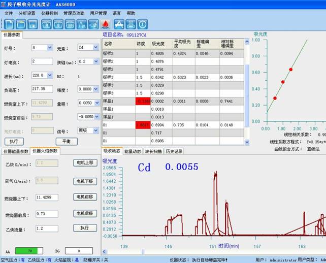 于原子吸收光譜儀 228.8 nm 處,使用空氣-乙炔貧燃火焰,以水調(diào)零,測(cè)量試液的吸光度,減去隨同試料的空白試驗(yàn)溶液的吸光度,從工作曲線上查出相應(yīng)的鎘濃度。