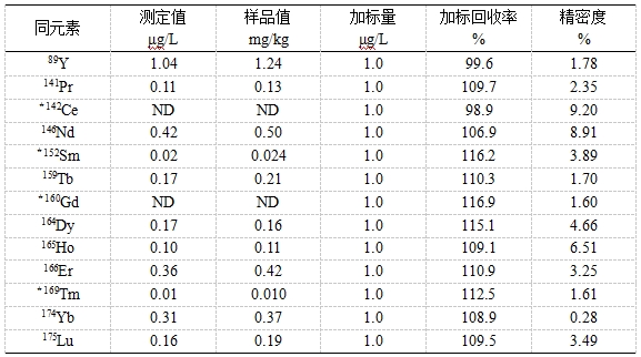 參考《GB/T 18115.1-2020 稀土金屬及其氧化物中稀土雜質(zhì)化學(xué)分析方法 第1部分:鑭中鈰、鐠、釹、釤、銪、釓、鋱、鏑、鈥、餌、銩、鐿、镥和釔量的測定》,將高純氧化鑭用稀硝酸溶解,利用內(nèi)標(biāo)法進行校正??疾旒訕?biāo)回收率及精密度。方法加標(biāo)回收率為98.9%~116.9%,精密度為0.28%~9.20%。