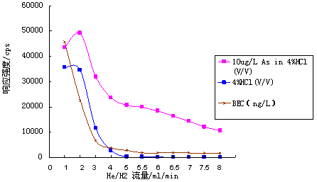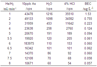 儀器首先在標準模式下進行參數(shù)優(yōu)化(利用10μg·L-1的Li、Co、In、U、Ce調諧液對儀器工作參數(shù)進行調節(jié),使儀器靈敏度高,同時氧化物及雙電荷產(chǎn)率小于3%);再開啟He/H2碰撞反應氣,逐步增大He/H2流量,測試超純水、4%HCl及10μg·L-1 As(4%HCl介質)在75amu處的響應信號,計算其背景等效濃度(詳細數(shù)據(jù)見表1及圖1);并利用As標液進一步優(yōu)化He/H2流量,得到儀器工作參數(shù)如表2所示。