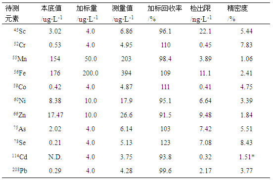在儀器優(yōu)化工作參數(shù)條件下,對樣品溶液及加標樣液進行測試,計算其加標回收率;對樣品空白溶液平行測定7次,以三倍空白信號標準偏差/靈敏度對應的濃度為檢出限;同時對樣品溶液平行測定11次(間隔2min),計算其相對標準偏差,考察精密度,數(shù)據(jù)見表4。各元素檢出限在0.41-22.07ng/L之間,加標回收率在93.82%-123.10%之間,精密度在1.06%-8.43%之間。
