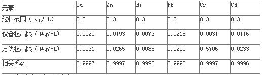 表3 ICP—AES測定土壤重金屬的線性、靈敏度、檢出限