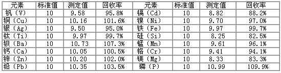 采用本方法測(cè)試潤(rùn)滑油金屬含量光譜分析標(biāo)準(zhǔn)物質(zhì)GBW(E)130129、GBW(E)130132,對(duì)比實(shí)際測(cè)定值與標(biāo)準(zhǔn)值,得出實(shí)際測(cè)試的回收率,得到準(zhǔn)確度數(shù)據(jù),結(jié)果見下表