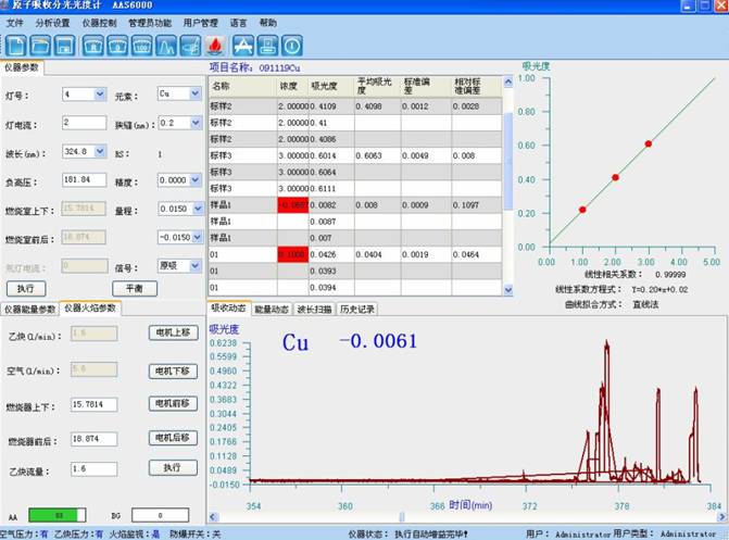 樣品測試:于原子吸收光譜儀波長324.8nm處,使用空氣-乙炔火焰,以水調(diào)零,測量試液的吸光度,減去隨同試料的空白試驗(yàn)溶液的吸光度,從工作曲線上查出相應(yīng)的銅濃度。
