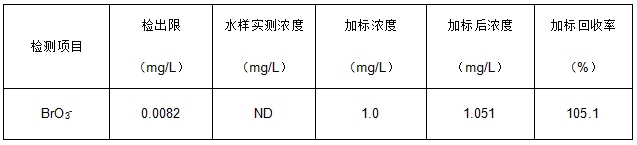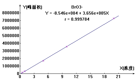 按照溴酸根各濃度點依次進樣,計算其峰面積,以濃度和峰面積繪制標準曲線,線性相關系數(shù)為0.9997,結果詳見圖2。