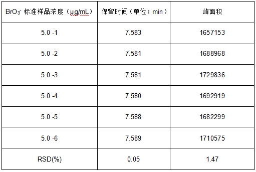 取5.0μg/mL溴酸根標準溶液重復進樣6次,考察保留時間和峰面積的重現(xiàn)性,重現(xiàn)性結果詳見表3。