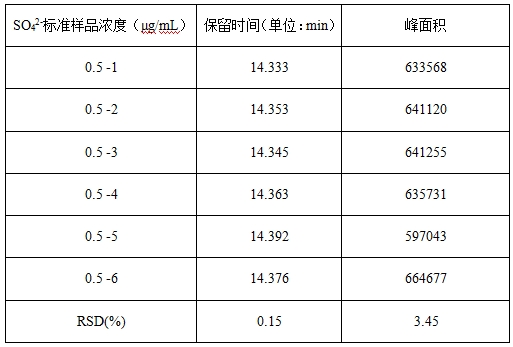硫酸根離子標(biāo)準(zhǔn)溶液采用梯度濃度的方式逐級(jí)稀釋為0.5μg/mL、1.0μg/mL、5.0μg/mL、10.0μg/mL、20.0μg/mL的標(biāo)準(zhǔn)溶液;詳見表1。