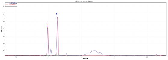 目標(biāo)物在0.5ppm-10ppm線性良好。取空白塑膠樣品加標(biāo),樣品經(jīng)過正己烷超聲萃取。10ppm加標(biāo)水平(圖5),得到比較滿意的效果。
