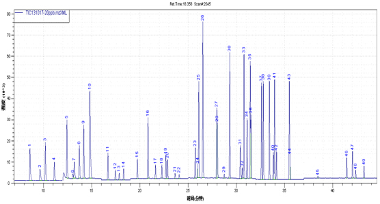 圖2. 54種揮發(fā)性有機物(VOCs)標準物質(zhì)在SIM模式下的TIC圖