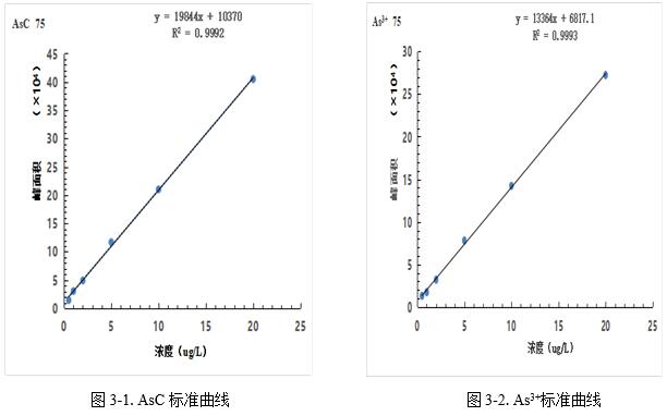 圖4為5.0μg/L混和標準溶液色譜圖,以各形態(tài)峰附近基線處的3倍信噪比(S/N)峰高對應的濃度作為檢出限,AsC、As3+、DMA、MMA、As5+分別為0.078μg/L、0.10μg/L、0.11μg/L、0.13μg/L、0.16μg/L。